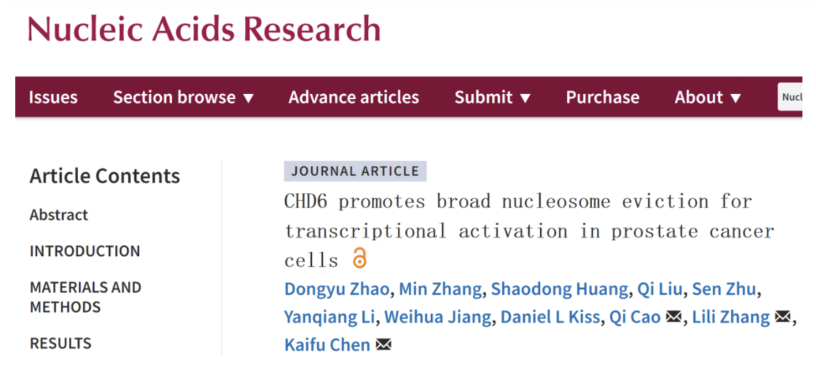 2022年11月21日,北京大学赵东宇,哈佛大学陈开富,张丽丽及西北大学曹圻等人在Nucleic Acids Research(IF=19)在线发表题为“CHD6 promotes broad nucleosome eviction for transcriptional activation in prostate cancer cells”的研究论文,该研究表明CHD6促进前列腺癌细胞中核小体广泛”排出“以转录激活致癌途径。该研究发现CHD6与染色质结合,促进核小体的广泛"排出",从而激活许多癌症途径的转录激活。通过整合多个患者队列,对一千多个前列腺癌数据集进行生物信息学分析,发现CHD6在前列腺癌中的表达升高与不良预后相关。